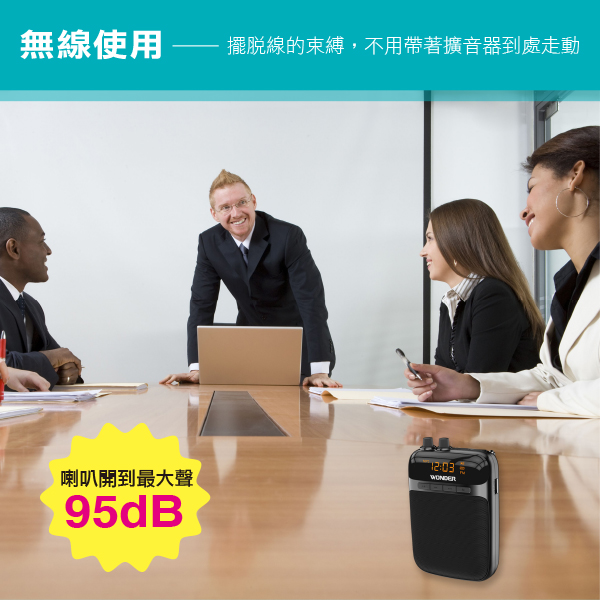 WONDER旺德 充電式無線教學擴音器 WS-P015 商品特色: ◆無線麥克風,使用沒束縛,擴音聲音清晰嘹亮 ◆機身輕巧,電力十足可連續使用8小時 ◆可插TF卡、USB直接播放MP3音樂,使用更方便 ◆AUX功能、錄音功能、收音機功能應有盡有 ◆電池電量顯示功能 ◆附腰掛繩,使用更全面